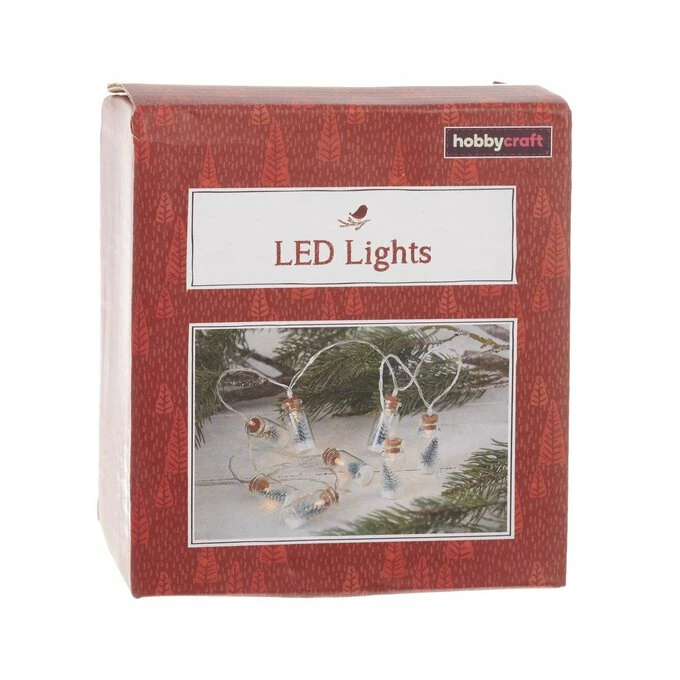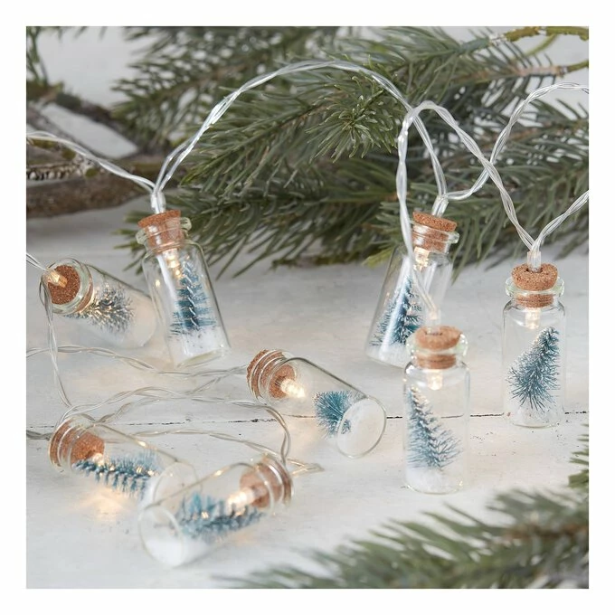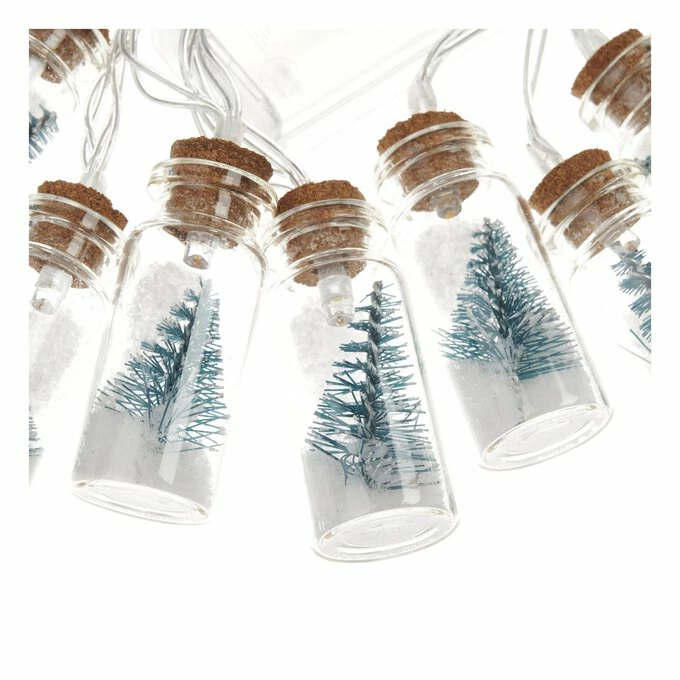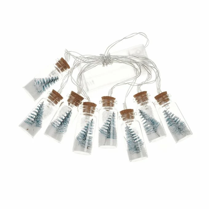The string lights feature eight mini bottle brush trees inside mini glass bottles, each with LED lights inside. Each individual bottle is designed as a mini festive scene.