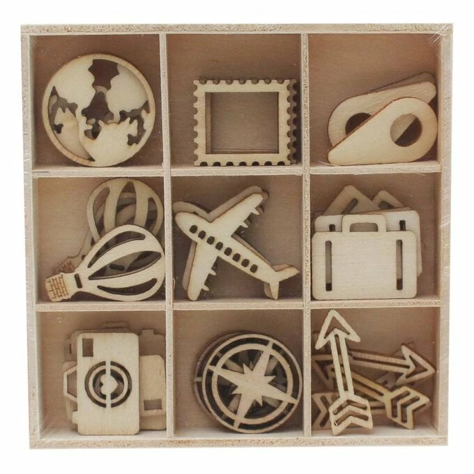 You can add them to your cards, scrapbook pages, gift tags and party invitations, or even items like photo frames for a stunning embellishment. The designs include hot air balloons, cameras, compasses, planes, suitcases and more. The natural wood shapes are easy to personalise with glitters, paints and more, for an even more unique finish.