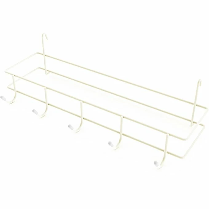 - Includes one base shelf, one dowel frame and one upper rack containing five storage hooks