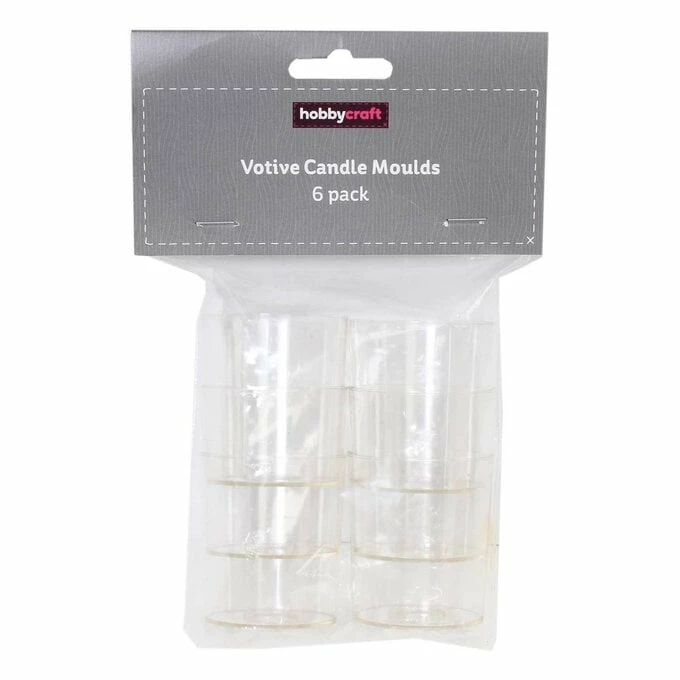 This pack includes six polycarbonate moulds for making votive candles. Use our natural or paraffin pillar blend wax for these moulds and the small candle wicks. Each candle will require approximately 65g of wax. When pouring in your melted wax, ensure that the hot wax does not exceed 120 degrees Celsius so as not to distort the mould.