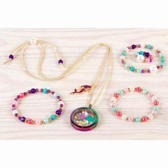 The set is the perfect choice if you want to create stunning mermaid-inspired jewellery, with pearls and an iridiescent locket to create unique designs. You’ll have 60 gold beads, a metal locket, 50 plastic beads, 45 plastic pearls, 30 miniature pearls and gems, a unique charm, braided cotton cord, clear elastic cord, instructions, a Play Tray and access to the free app.